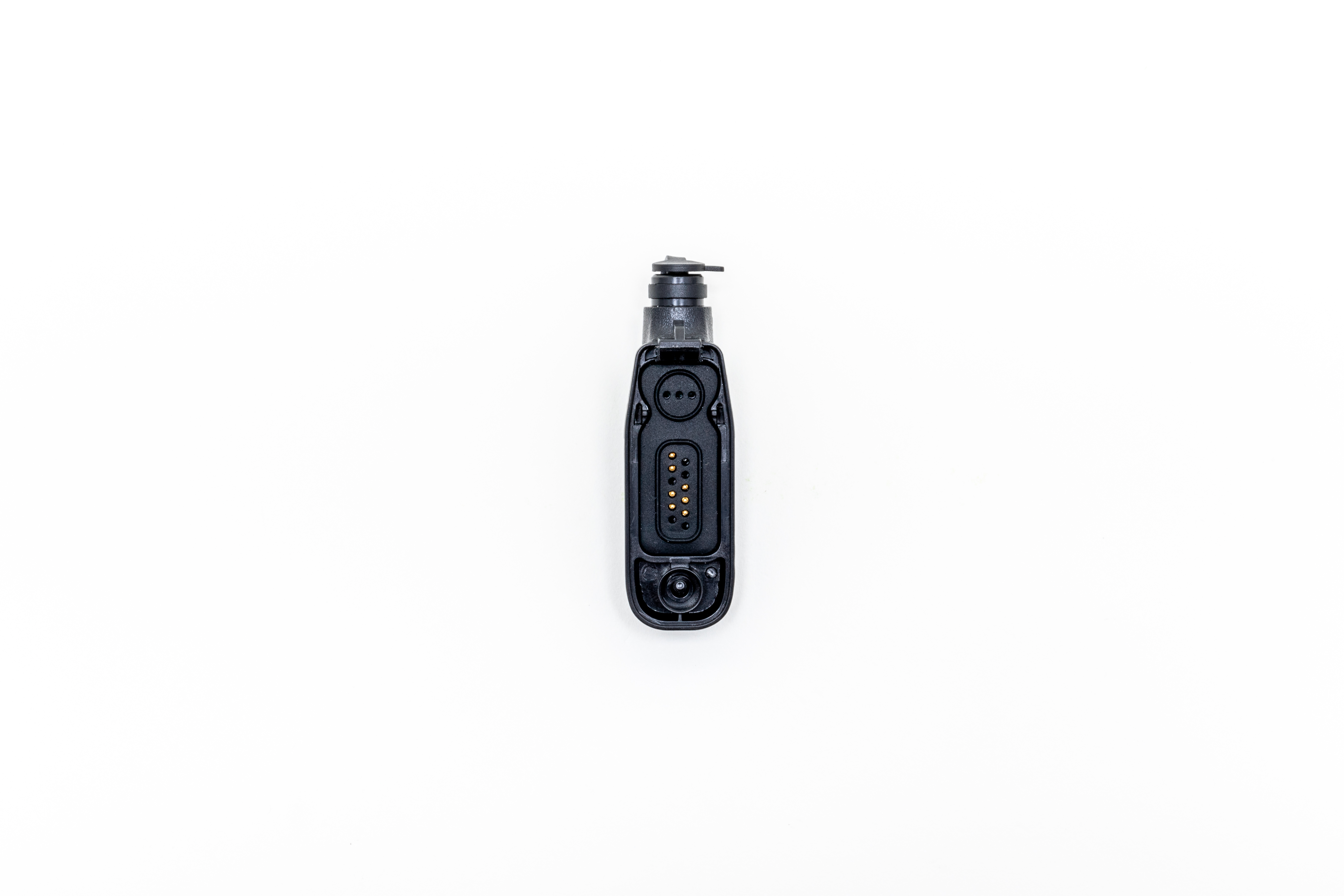 This adapter converts a single pin, 3.5mm threaded connector (M6) for use on Motorola APX/XPR radio models.